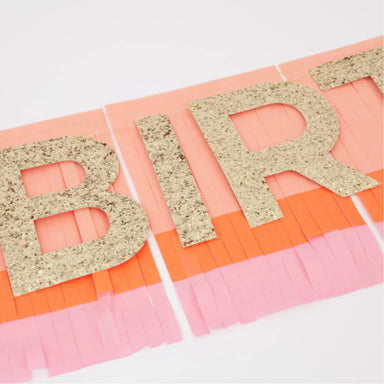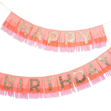 BRIGHT PINK & CORAL HAPPY BIRTHDAY FRINGE GARLAND WITH GOLD GLITTER LETTERS Add a pop of color and fun to your birthday celebration with this...