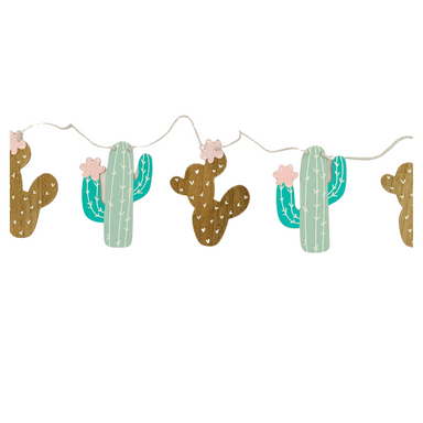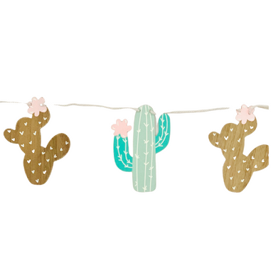 AQUA AND NATURAL CACTUS WOODEN BANNER This festive wooden banner featuring alternating aqua and natural wooden cacti with pink flowers, is perfect ...