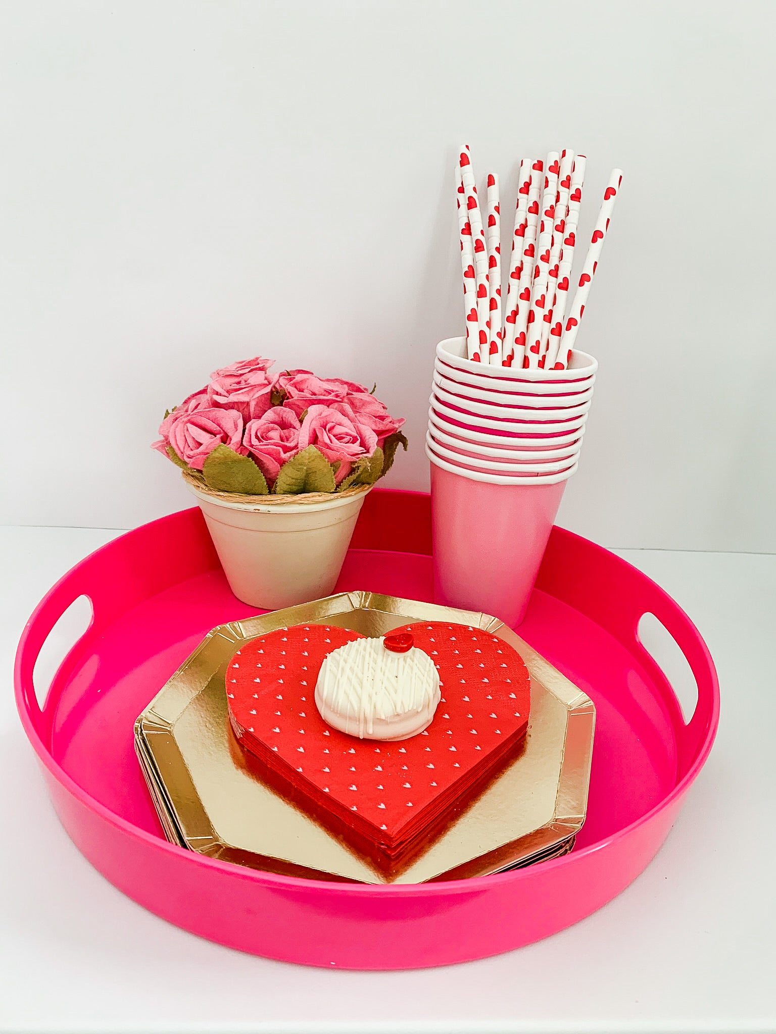 Add a pop of color and functionality to your home or party space with the Hot Pink Party Serving Tray. This modern, round tray features built-in handles, making it a convenient and stylish choice for serving drinks, snacks, or small decorative items. Its vibrant hot pink color makes it an ideal choice for Barbie-themed parties, bachelorette celebrations, pink parties, and much more. Whether you're hosting a special event or simply want to elevate your home decor, this tray is a perfect fit for any occasion.