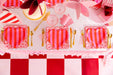 - 24 pack of soft pink and white striped napkins with red scalloped edge